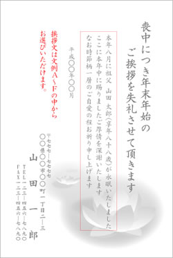 | ○月に○○○が○○歳にて永眠いたしました ここに本年中に賜りましたご厚情を深謝いたしますと共に 明年も変わらぬご支援のほどお願い申し上げます |