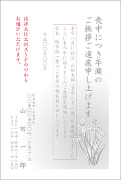 | ○月に○○○が○○歳にて永眠いたしました ここに本年中に賜りましたご厚情を深謝いたしますと共に 明年も変わらぬご支援のほどお願い申し上げます |