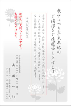 | ○月に○○○が○○歳にて永眠いたしました ここに本年中に賜りましたご厚情を深謝いたしますと共に 明年も変わらぬご支援のほどお願い申し上げます |