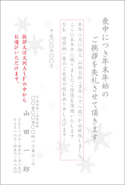 | ○月に○○○が○○歳にて永眠いたしました ここに本年中に賜りましたご厚情を深謝いたしますと共に 明年も変わらぬご支援のほどお願い申し上げます |