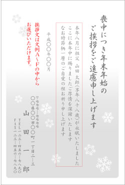 | ○月に○○○が○○歳にて永眠いたしました ここに本年中に賜りましたご厚情を深謝いたしますと共に 明年も変わらぬご支援のほどお願い申し上げます |